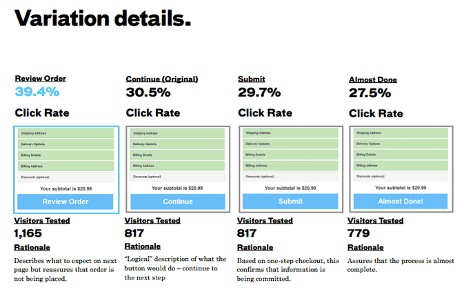 Examples of A/B testing include subtle changes in homepages images, little tweaks in format or shortening certain posts. In Insounds A/B experiment, they set up four alternative checkout buttons to know which performed best in click rates. Here is the result:
