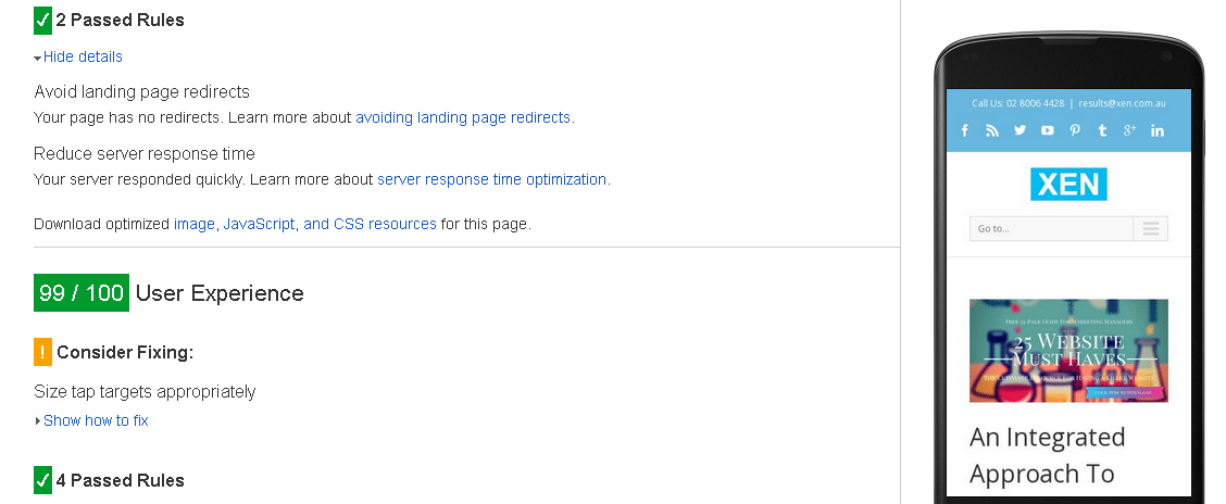 You will get this message if your site is OK, along with any suggestions for making your site even better for mobile. If you carry out a test on the Google Page Speed site then you will also get a score out of 100 for the site overall, for mobile, site speed and for UX along with suggestions about changes you need to make.