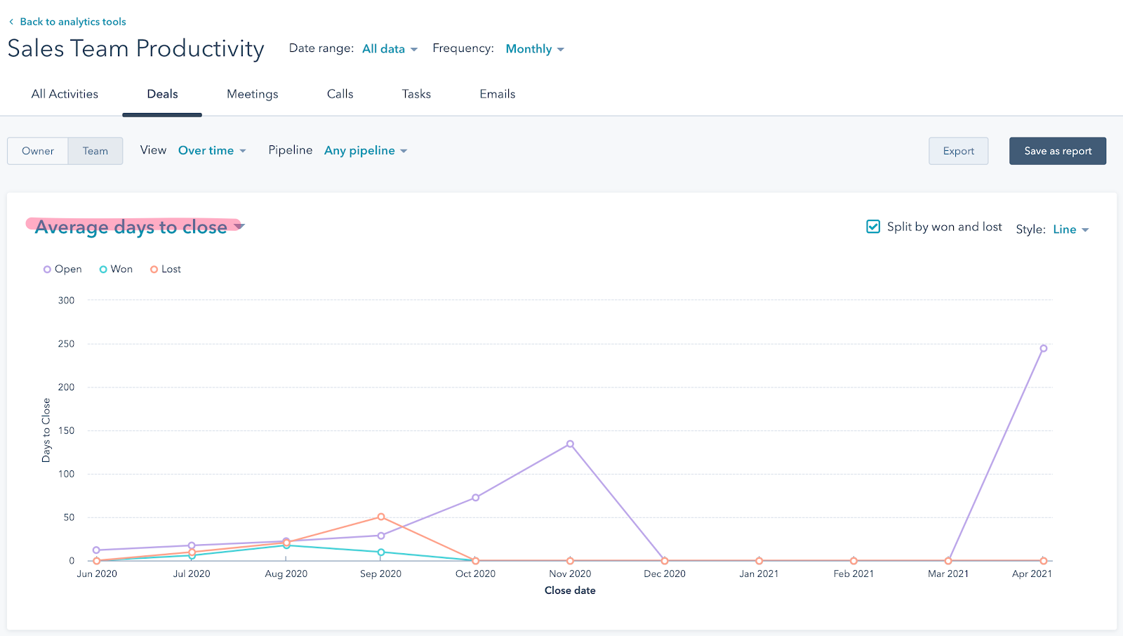- Now listeners onto our HubSpot sales feature of the week. And this is to do with the report. And if you're in sales and you're looking at different metrics to, what drives sales and how to close things quicker, this is a good report. And this is the average days to close report on the sales team productivity dashboard. And you can actually add this to, a dashboard as a report as well. But what's interesting out of this is, look at it in a perspective of how do you understand, based on seasonality perhaps. Are things closing quicker or taking longer to close? So I guess what's interesting in the screenshot that I gave, which is from one of our portals, is that there are obviously some deals that are a bit more in the future into next year and potentially the days to close on that is now cutting from now to that period. So it just seems like it's a long, it's a long laid time and that could be possibly because they've had a conversation with somebody and they've said, look, we're not looking at doing this til March, 2021. So just to understand that, and I guess you can see what's been won, what's been open and what's being closed. So it's a really good indication of understanding and then drilling deeper into what sort of activities are making this work or go faster or slower. So I thought I'd highlight that today as an example.
