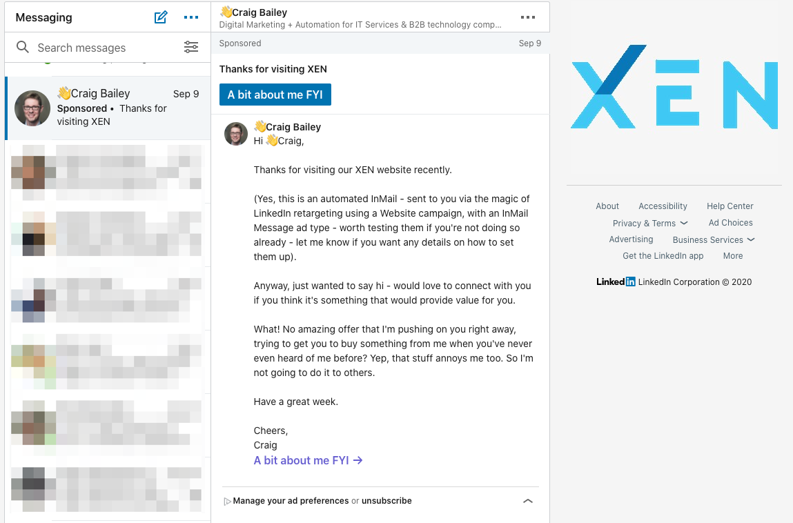 - All right. I alluded to this last week in the show, but we ran out of time. Just talking about LinkedIn Sponsored in miles with three targeting. So I'll give you the scenario how we use it. I've got a screenshot here of the way we do it. So if people visit our XEN site, we have the LinkedIn Pixel, so they get pixeled and then we retarget to them. So I've got a campaign in LinkedIn and I choose in terms of targeting. I'm just choosing that retargeting audience, people that have visited the XEN site and I send them a sponsored InMail. So it's an email that comes from me via LinkedIn and LinkedIn InMail comes from me. And I just have a little message there where I kind of say thanks for visiting. And in the message we've got a screenshot of it. I just say, "Look, yes, this is an automated InMail. I'm not trying to sell you anything I just thought might be as sort of connect. You might like to try this tip yourself. So these is what I've got. And it's actually reasonably successful. I've actually had a new client last week who came and visited the site and they contacted me saying, "Oh, how do you do this? Can you help us do LinkedIn?" So it's actually driven a customer believe it or not. True story. So I just sort of mentioned that. It seems I haven't seen a lot of it and people do seem to respond to it as if it's quite a novel idea. I've think I've had it running for two years or whenever. So yeah, just a little tip, very easy to set up and to try and you might get some results. So I was thinking we should probably try it with HubShots. And then if people visit the HubShots site, we should hit them up on LinkedIn and say, "Hi, thanks for visiting the HubShots site." What should we ask them to do? Connect, but don't try and sell us something in the website or tell a friend. We should say if you, or actually no, we should point to the subscription options. You've visited the site, can subscribe on your favorite podcast. Look, my point is there's plenty of ideas, right? And it's very simple and sponsored InMail is quite economical. I think I'm getting about 23 to 25 cents per engagement where people get it in their inbox and look at it.