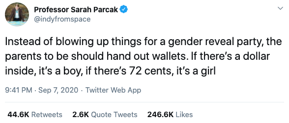 - Okay. So that's good. So I haven't offended you, that's good. Anyway, that's what kicked it off. They're having a Gender Reveal Party and they set off some fireworks, either blue or pink, and the fireworks started the fires. And thousands, hundreds of thousands were acres of burned down. Anyway, someone put a tweet on Twitter and they said, and it was professor Sarah Pocock and she says, "Instead of blowing up things for a Gender Reveal Party, the parents to be should hand out wallets. If there's a dollar inside, it's a boy. If there's 72 cents, it's a girl." All right. So that's the tweet. They got a lot of shares and likes. I just thought that was a perfect way to capture a moment and yet highlight a social issue in terms of inequality in a humorous way, but was also undeniable. It's just the perfect tweet I think. If I look back on this yogo, that's one of the perfect tweets in terms of timing and...