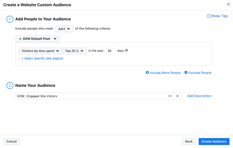 - Good little reminder, like this is a simple stuff, but a good reminder, just how to set up custom audiences in Facebook for your most engaged website users. So this is retargetings or a pixel on your site. So people are coming, you're creating an audience of the people that visited your site for the most time and that's a simple setting, you can say visitors by time spending, just choose top 25%, pretty easy to find. I've got a screenshot in the notes from one of our Facebook accounts on how to set that up.