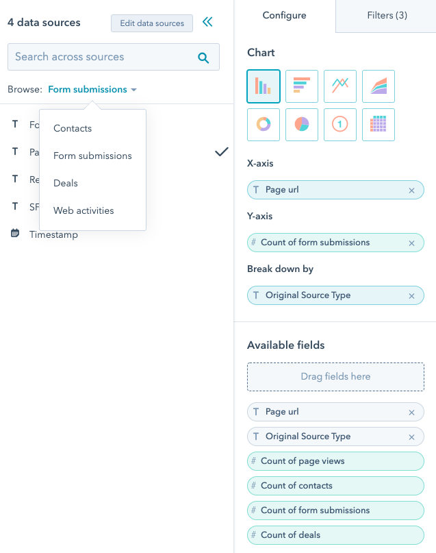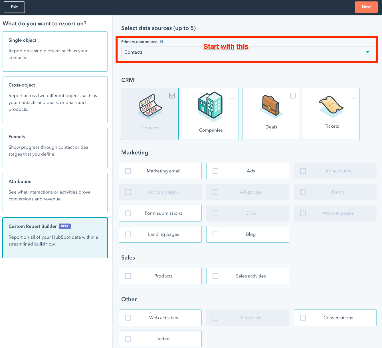 - Yeah, look it is a bit daunting at first. My first comment is I wanna say, don't be overwhelmed by it when you first go into it, it's like, oh, well I've put a screenshot in the show notes right at the top, your primary data source. That's what you need to start with. And I've made that clear. So if you haven't yet actually looked at the beta one, the one I'm talking about, but once you see it you'll know. It's kind of hidden up the top. And I think you've both missed this originally cause we just saw those tick boxes and we went crazy ticking things, but that's where you start the primary data source. That could be clear, but once you get that, you're gonna riot. So that's my primary data source. Then I'm gonna join it with all these other data sources. And the great thing is, you can report on just about anything now. So before it was like contacts, companies, deals and tickets. They're the four things you'd report across. Now, they've got all these other objects, things like form submits, web activities, add metrics, add keywords, CTAs, and you can join across them all. It's really good. How far have you gone into this so far?