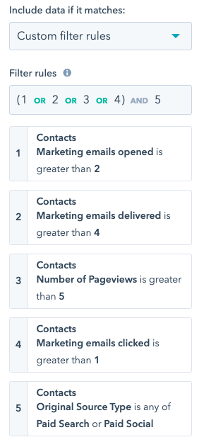 - So they've got all these pre-prepared reports just drag them or plunk them on your dashboard. But here with this new custom report builder, you can get very sophisticated about the reports you build joining across things. And we've got a few examples in here. Like I joined across web activities with form submits, with contacts, joining across them all to produce reports. I've got some screenshots where I actually wanted to drill into web activities to see the kinds of terms people were searching on HubShots. You know, we added the HubShots search thing. So I've got an example of that. And look, plenty more notes in the show notes. But the other thing that I will just call out, is that there's custom filter roles. So this is really good. Previously with reports you'd filter down. So you'd kind of filter down and down. They were almost like always an and. This and this and this and this. Whereas now you can see them on the screenshots of what they, you can actually put your own parentheses in. You can say this or this or this and this and you can do that kind of ordering of parenthesis for how it's filtered. It's really powerful and simple pick two in--