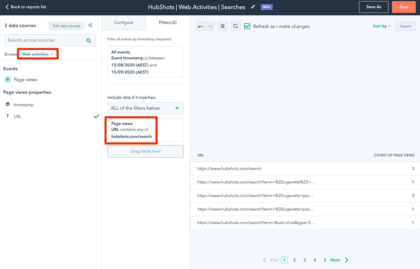 You can report across web activities - here’s an example of filtering web activities to report on what Searches are conducted on the HubShots site: