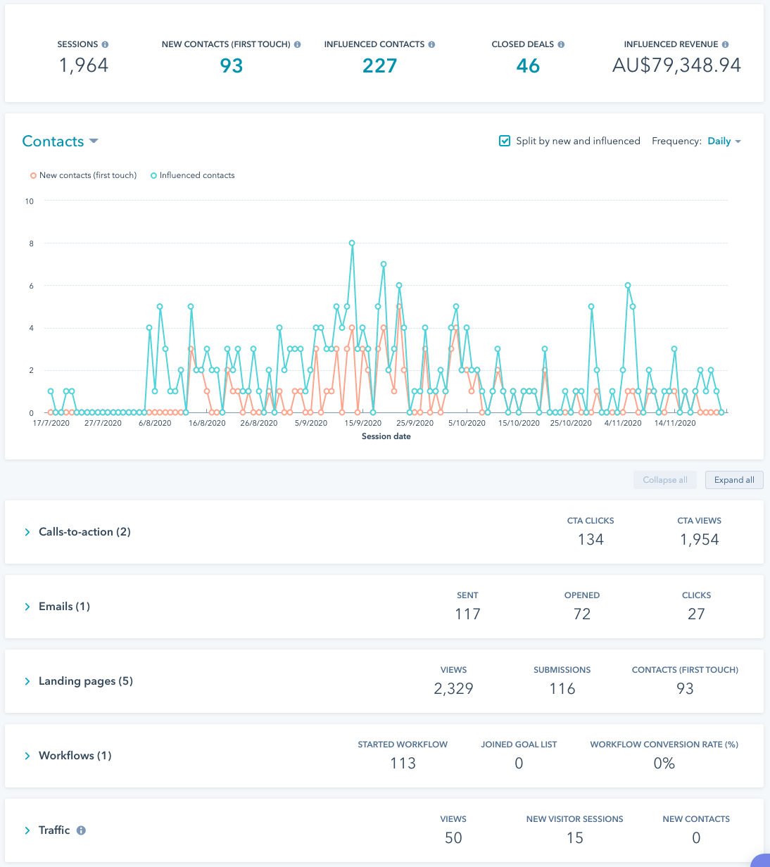 - Well, this is it. And look, it's a bit of a two-edged sword this, because in some ways it's very helpful, but in others it's a little bit misleading. Influenced revenue, influenced contacts. The reason it's great is because you can see a campaign did have influence, or did impact contacts and revenue. But often the way that that influence revenue is calculated is just any touch with any campaign. So you kind of have a campaign which might not have been incredibly successful, but it tended to touch a few contacts, and they might've been sold and closed by other campaigns, they are counted in influence revenue. So just be aware that it's good and bad. The good though is that you can see if a campaign has no impact on revenue or contacts. In some ways, knowing what's not working is valuable intel. That's quite actionable, right? You run a campaign for a month, no influenced contacts, no influenced revenue, let's turn that thing off, right? Okay, so that's the value of a negative result, but on a positive result, and we've got a screenshot here from one of our clients, just seeing how all the things tie together, all the assets, landing pages, emails, CTAs, social interactions, blog posts, all of that kind of thing pooled together. The important thing is to make sure you're doing proper URL tracking. So get the URL Builder involved, especially for sharing on social. Make sure all your campaigns are linked together with an asset, and then you'll start seeing the data pooled together into a nice overview.