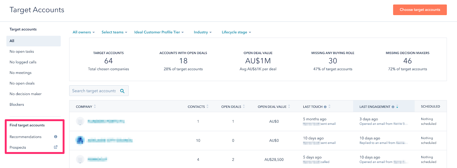 - The second one we wanna talk about is making sure you've actually put in the data and it's tracking. Now, why do we say this? There is a recommendations tab, or the little icon where you can click and you get recommendations in the system. And it will show companies that HubSpot thinks might be a good fit as target accounts. Each company is like an existing target account, based on industry size, page view data. So as you choose more target accounts over time, the recommendations do become smarter and better in the system. So, just be aware of that. Again, like we say, garbage in, garbage out. So the better you do this, the better you get a recommendation. Number three, Craig?