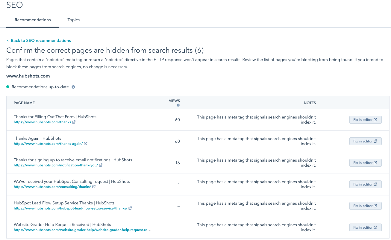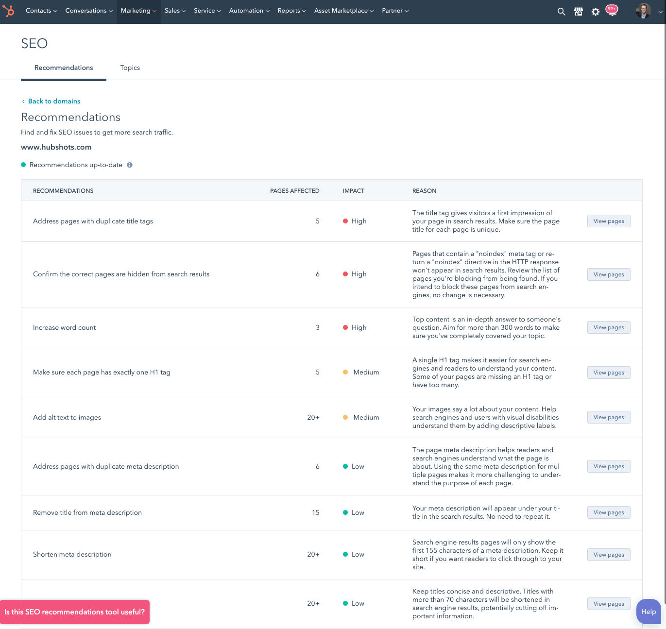 As well as these domain level recommendations, HubSpot also provides recommendations at the page level when creating/editing content: