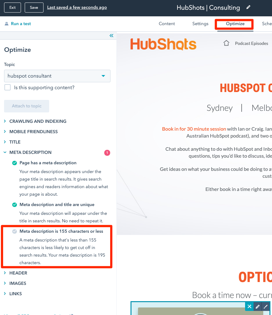 - That's right. You can link in Search console for some of the SEO planning. In the show notes, I've got screenshots of the actual recommendations page, and this can be set up at the domain level. So for example, we've got some recommendations there for the HubShots domain, and they're very easy to review, and also you can action them on the spot, so that's quite nice. And then drilling down further at the page level, there's a whole optimized tab. It's kind of, they put it front and center. It's not like you can miss it. The optimized tab, which will give you actually recommendations for the page. And so, this should be part of your go live or publish process. You've got a page, okay. The contents ready and reviewed, great. Now just check the optimize tab, engage those recommendations, publish, and you're live.