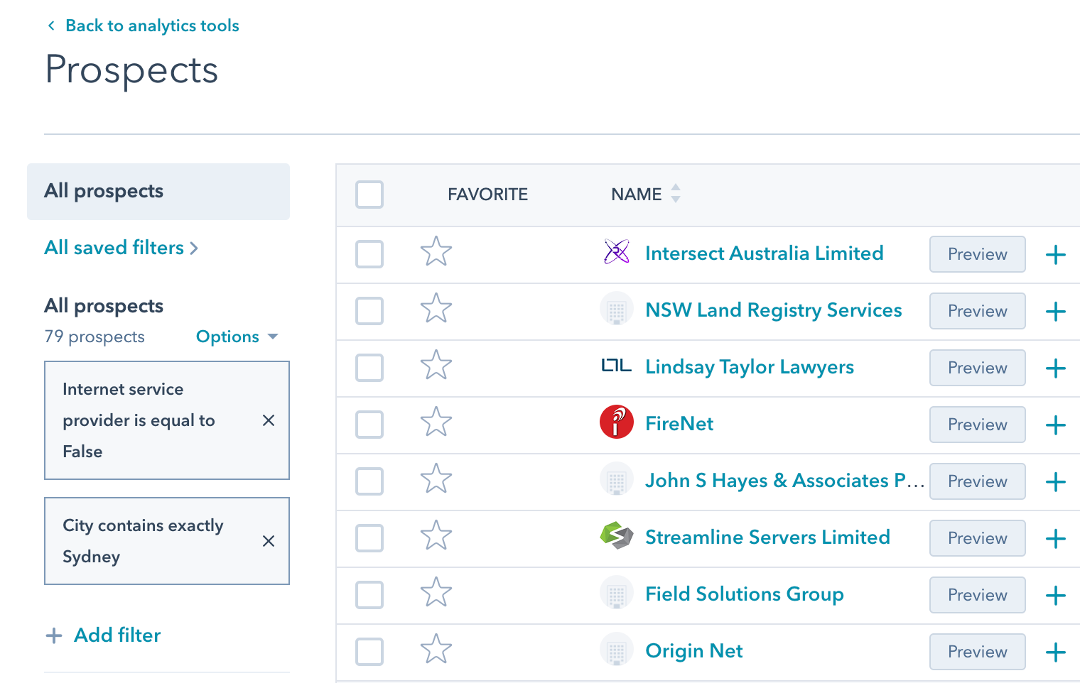 - And a tip here is when you're using prospects tool and you're trying to, not just look at the entire bit of data, is use the filters on the left-hand side to narrow this down. So a really common thing we would do is narrow it down by city, for example. So in the example, we just wanna see all the companies that have got Sydney in them, right? Or the origination point is Sydney. And it's a great way to narrow this down. By default, you'll say if it's an internet service provider, we don't wanna see that. Some of them get through, listeners, but there is a way to get this out of the way. So, it's a great tool to utilize. And number four, I think we've highlighted this is, what this does is get the sales and marketing teams working better together to understand who they're marketing to, and how they should market to. And we put a link in the show notes to some ABM training that HubSpot Academy has done. And I would encourage everybody, even if you don't use this, do the training, because it might open your eyes to something else that you can do differently in your business.