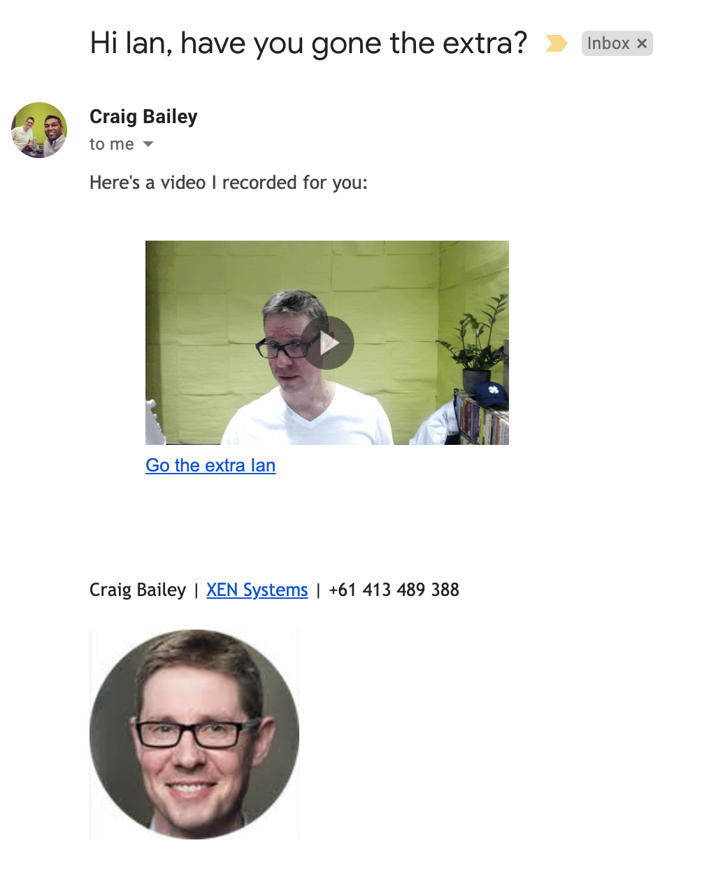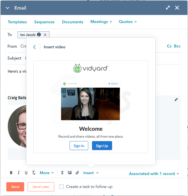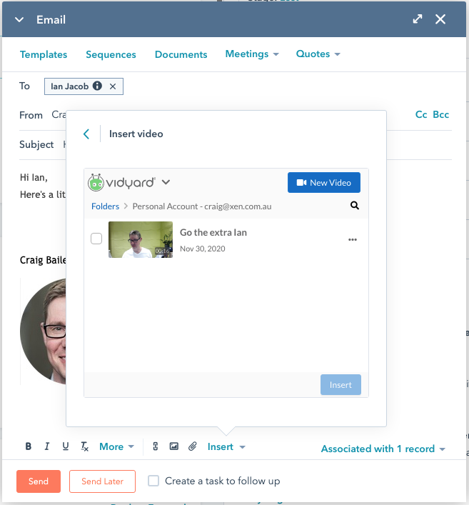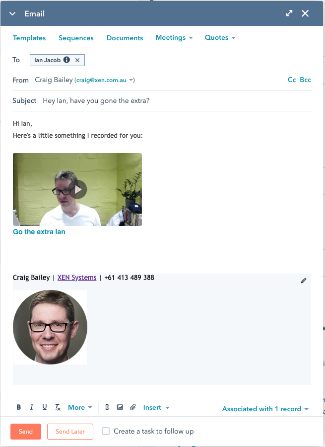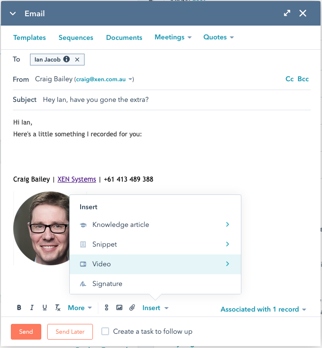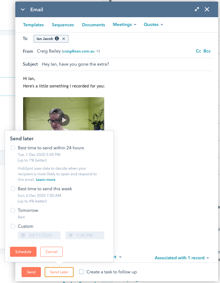- And that's my second one, Craig. And this is generally done after people say, "Look, it's not the right time right now "but I'd still love to hear from you." And this is a good way with large chunks of time in between to actually keep someone in a sequence and make sure they're engaging with content. So they would often not require them, the goal would not for them to reply back but to keep them maybe in three monthly blocks, getting some sort of email that is of value. And then if they do reply or they do call then to initiate the conversation. But those are two ways to really use it well. On to shot seven is one-on-one video creation. And this Craig, is not native to HubSpot, let's say but this is an integration with NVIDIA and allows you to quickly record videos and insert them into emails that you send people. Now, why I think this is good, especially in the period that we've just been through and potentially, people were overwhelmed with what was going on. This is a really good way for people in sales to connect with other users in their own time. So one of our customers, their customers happen to be really busy because they were cleaning businesses and they were overwhelmed. So they were struggling to get through. And one of the things we did was encourage sales to record personalized messages, to send it to others which made an impact because people watch that in their own time. So it was when they were able to get to it. And two, because it was different, some people ended up passing on to other people in the business to say, "Hey, look what Craig sent me." And made its way around the business. So it was just a point of difference and a different way to connect with people. I think it's one thing, reading something. And I think when you see somebody and you are able to see their expression and see their genuineness when they're talking to you, that's unscripted makes all the difference. And the more you do this, the better you become.