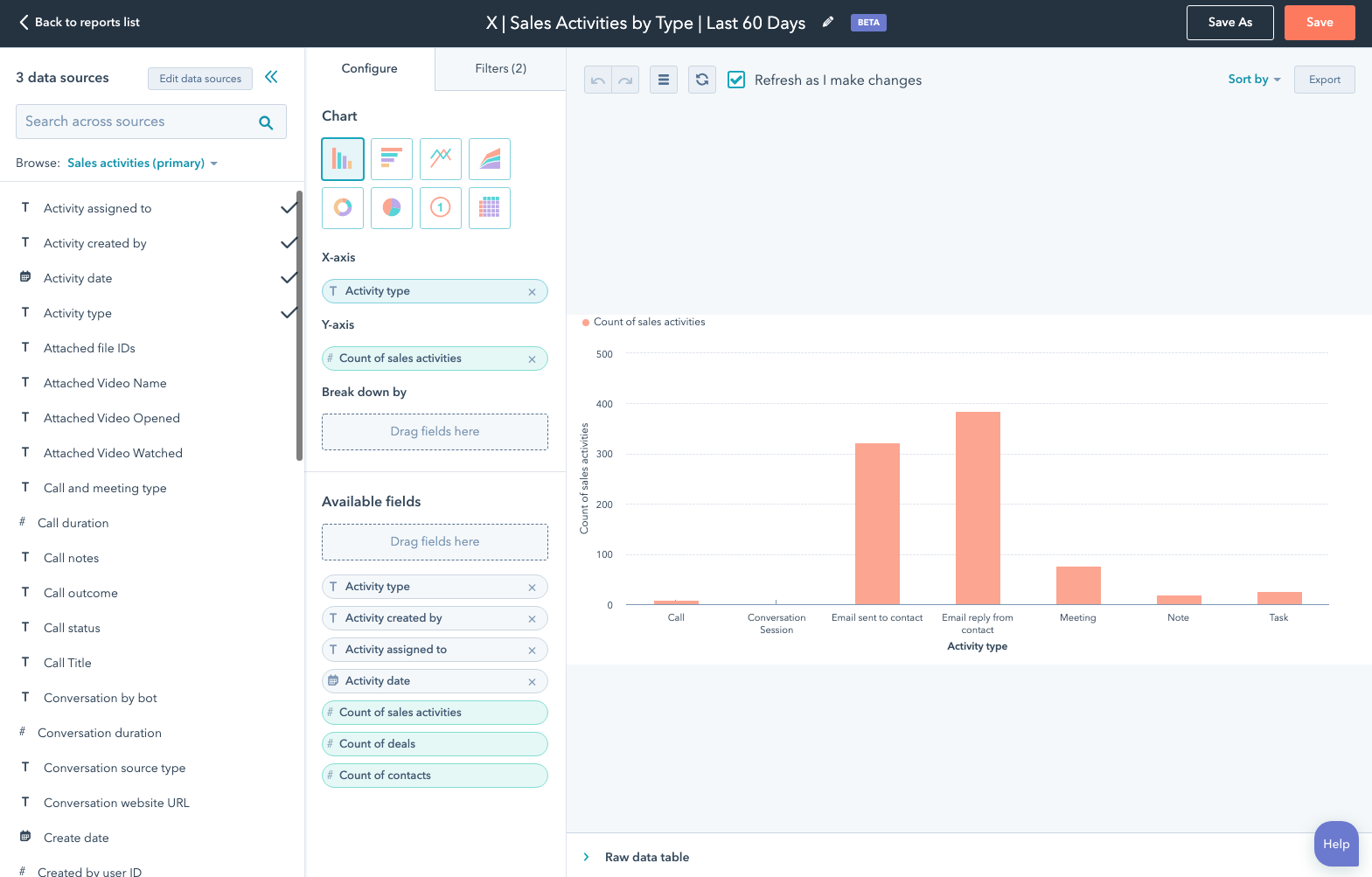 - This is a follow on and a good example following on from an earlier point where we were talking about just the general sales analytics report not being as customizable as we'd like. The custom report builder gives you a lot more power. It still is in beta. And I'll say, Ian, and as you know, we were fighting with this earlier and I've actually sent off a note to HubSpot support about trying to drill down into it. So it was good at selecting, good at first visualizing, but then trying to drill down. I actually wanted to drill down on sales activities by person, by type, but yet filtering out if the contact that they were having an activity with was a customer. I just wanted prospects and opportunities so that we could filter it down just to actual sales rep activity. And then I wanted to create another one, which was just for customers because I actually wanted an upsell report, how much sales activity is going into upsells. The custom report builder is the way that you can analyze that.