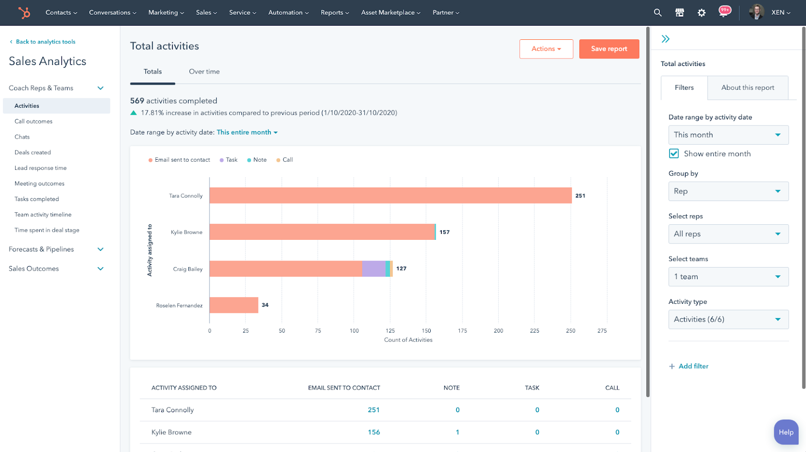 HubSpot Sales Analytics Reporting allows you to drill into emails, calls, meetings, tasks and notes that sales reps are logging against prospects.