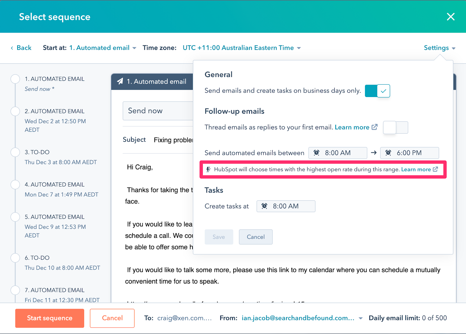Further to our shot above about sequences, a useful feature of the Email sending is that HubSpot will automatically choose the best time to send: