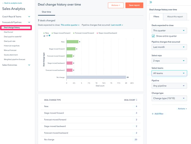 This is an ideal report for sales managers to view changes on your deals over time. See what's changed on your deal amounts, stages, forecast, and close dates.