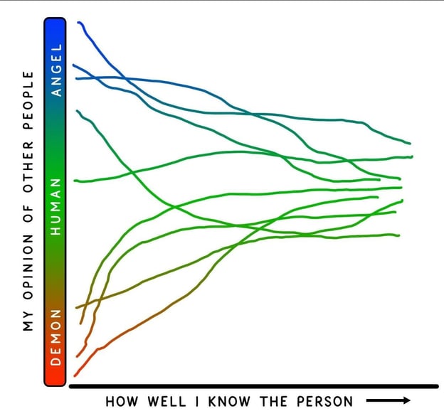 - You know what's interesting in this graph, listeners, one of the axis, it says, my opinion of other people starts a demon, goes to human, and then goes to angel. And how well do you know the person? And over time, what this graph shows is that if you started either in a demon or angel, it all converges to human, right?