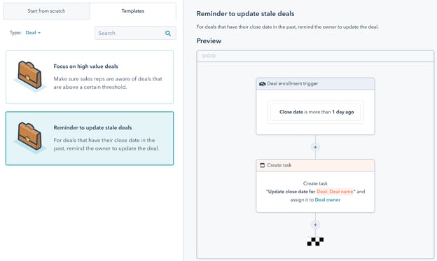 - All right, onto our HubSpot's sales feature of the week. And listeners, if you're using HubSpot sales professional enterprise, this is something that you should definitely get started with. And I'm gonna highlight two most common deal workflows to start with. And the first one being, to focus on high value deals. And so it's pretty simple. It's like if a deal value is over this, then you need to get a notification to look at that. And probably more so if a deal is being sent to somebody that is not necessarily working on it initially but then gets notified that they are working on it. And the second one is to remind it to update stale deals. And this happens very often and people will ignore things and not close them off appropriately. And so what this does is, put a task in your task to remind you to update the close date for a deal.