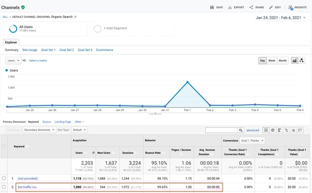 - Check it out. The 31st of January in the US, 1st of February, Australian Time, you'll see these spikes in organic, just this massive spike and down. I've got a screenshot, actually, this is our site. And you can see we were hit. A few of our clients sites were hit. A few of our client sites had no impact, but if you suddenly got excited and thought there was a big organic boost, sadly it was just a bot spam.
