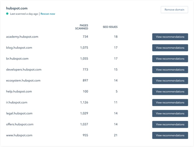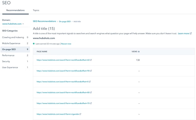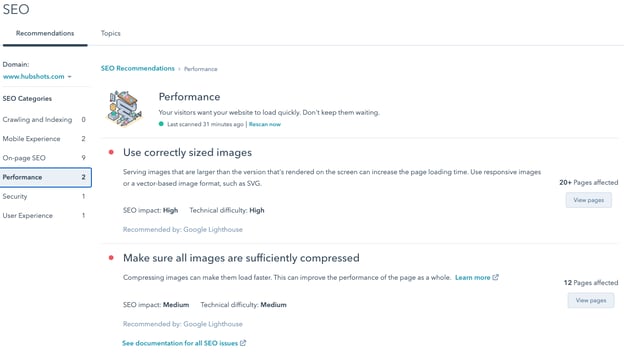 The initial scan can take up to 6 hours to finish and add recommendations. Once that’s done, then you can view the recommendations. Here’s some of the recommendations for the main HubShots site: