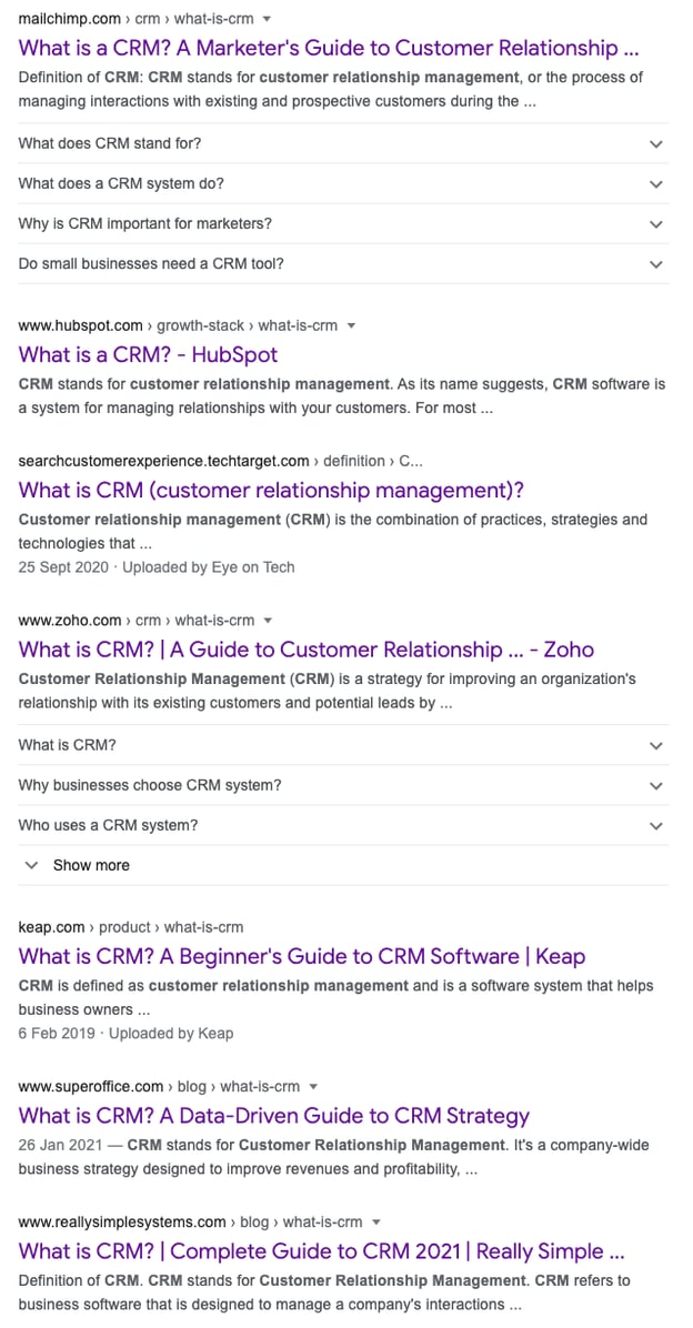 - They've kind of dominated it. And if you look at Google results, we've got a whole bunch of screenshots in the show notes. By the way, another reason you should sign up for the show notes. Salesforce kind of own all the terms. What is CRM? What is a CRM product, et cetera. Interestingly, Microsoft owns the broad term to CRM. That's right, at number one. But Salesforce is planning on that. Cause I know Salesforce put a lot of effort into this. Shout out to Mark Vaseux who was with the Salesforce team at the time. I know did a lot of work to rank number one for CRM. So a bit of a battle on there. But what's interesting though, is that you find one of the high ranking pages was MailChimp on CRM. They've been pushing for it. Then you see Zoho and of course HubSpot in there for this term on CRM. So what's your thoughts on this, Ian.