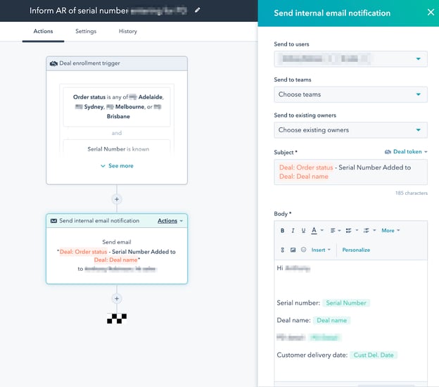 When you get past this there are things that you may want to do. For example, if the deal gets to a certain stage you can create a task informs customer service that there is now an associated serial number and delivery date so they can action the request.