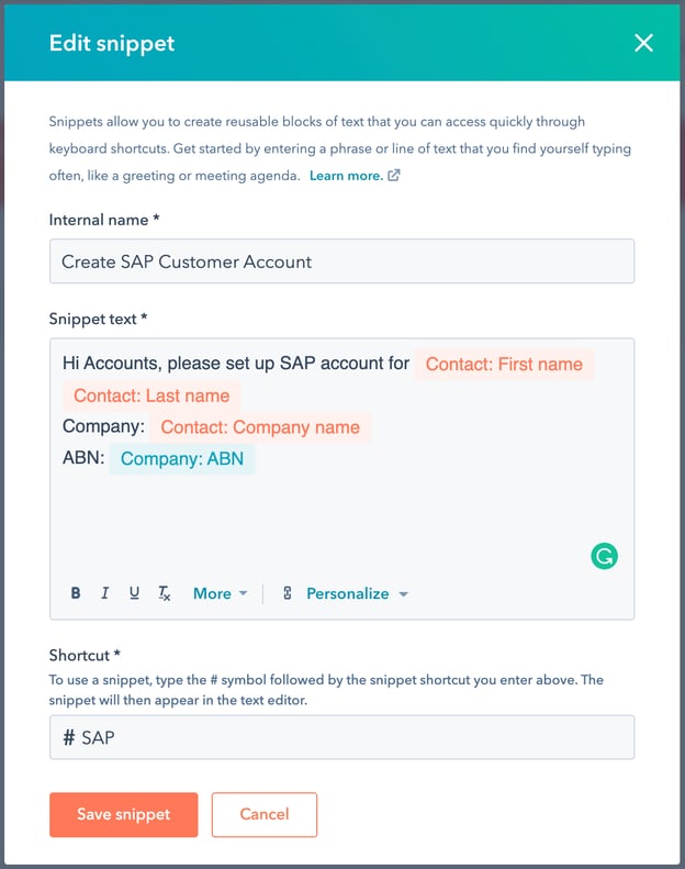 - Gotcha. All right, HubSpot sales feature of the week, Craig. And this is using the power of HubSpot snippets. And remember listeners, you can use the system-wide to speed up responses and avoid mistakes and time finding customer and company information. I've put an example there of a snippet that one of our customers use. And you can use this across the system, but they were using contact details and company details in this snippet because I found out sales were spending lots of time trying to dig up information about our customers, to send it to their accounting team, to get a particular account created in SAP. And so I said, well, let me help you speed up this process. So we were collecting the data into HubSpot. There are some custom fields in there, like in Australia we have the Australian business number. And so we're collecting those details. So when we had to get the account created, it was really, let's put this snippet into a task and send it off to the person in accounts to fulfill it. So there's a good example of snippets. Now another pro tip listeners, when you are creating snippets, create the folders and organize your snippets correctly instead of having it all in the root, because that'll help you as your team grows and as things grow within HubSpot, it'll help you keep everything organized. And as a bonus, if you get the show notes, there is an academy lesson about snippets as well. Okay, the HubSpot wishlist item of the week, Craig.