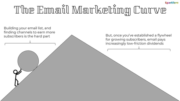 - [Craig] Did you see this another one post from Rand Fishkin, where he's now at SparkToro and he was talking about visualizing your marketing curve. I thought this was a very good way to, well, visualize, conceptualize each of the different marketing channels. Let's say SEO, SEM, email marketing, influence marketing about the difficulty to get them going. And so I won't take too much away. I just think it's a good resource I've got actually, one screenshot from his article in the show notes, talking about email. And it's very simply you pushing up a hill and you get halfway through and then you've got the momentum. And once you've got the start of an email list, it just becomes really easy to market and grow the list further. Compare that with SEO, which becomes not so much a hill and then a down incline, it's more of a curve. You build up the curve and then as say, anyway, it's got a really good way to visualize it. And I think the thing that I found helpful about this is if you think of all the different visualizations and then how they fit together, because normally when you're working on a strategy for your company or your business or your clients, you'll say, oh, we're going to do a bit of this and a bit of that channel and think about how they work and overlap. For example, SEO very much an uphill climb for the first six months, whereas paid might be a different kind of visualization. I think that's really useful to look at and you almost combine them to get a consistency throughout over time. Anyway, that's useful reading, worth checking out.