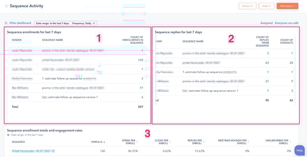 Reports 1 & 2 were created so we could see how many contacts have been enrolled in sequences and how many have replied from the sequence. What is interesting to note is that the count of replies from the sequence is not unique (or it is hard for them to tell) and hence we added the count of contacts to the 2nd report.