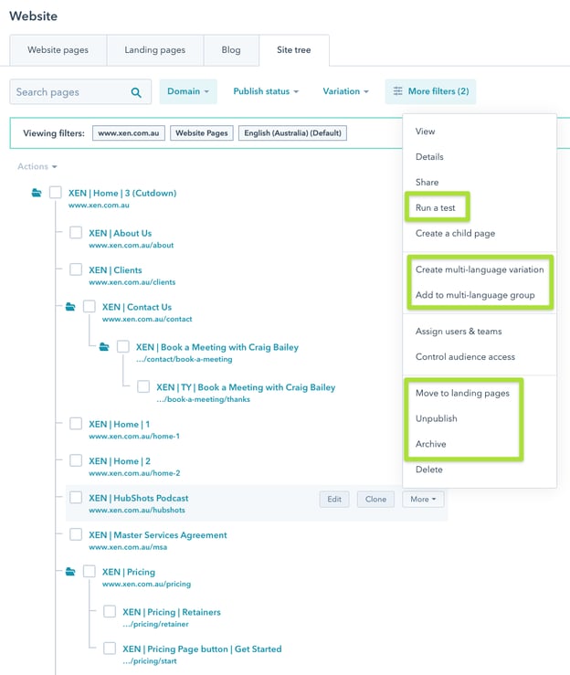 A quick note: the listing usually defaults to Website pages, you can easily tweak the Filter to be Landing Pages, or both Website and Landing pages.