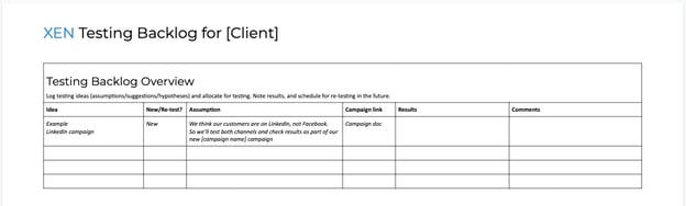 Following on from our discussion last week (Shot 8) about the need to test and measure, one quick tip to help with keeping track of test ideas is to create a simple Testing Backlog. It can be in a doc or sheet to get started, and move to a more sophisticated tool in time.