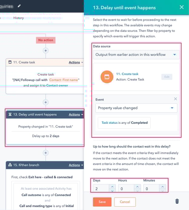 Here’s an example of the Delay until Event action that picks up on a previous action from the workflow.