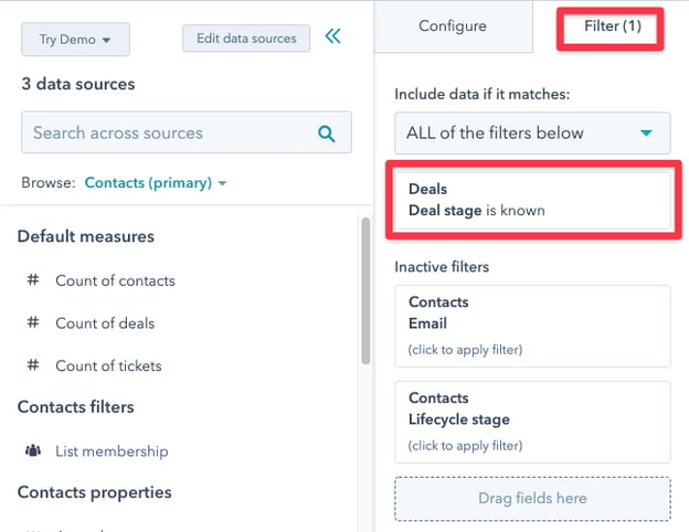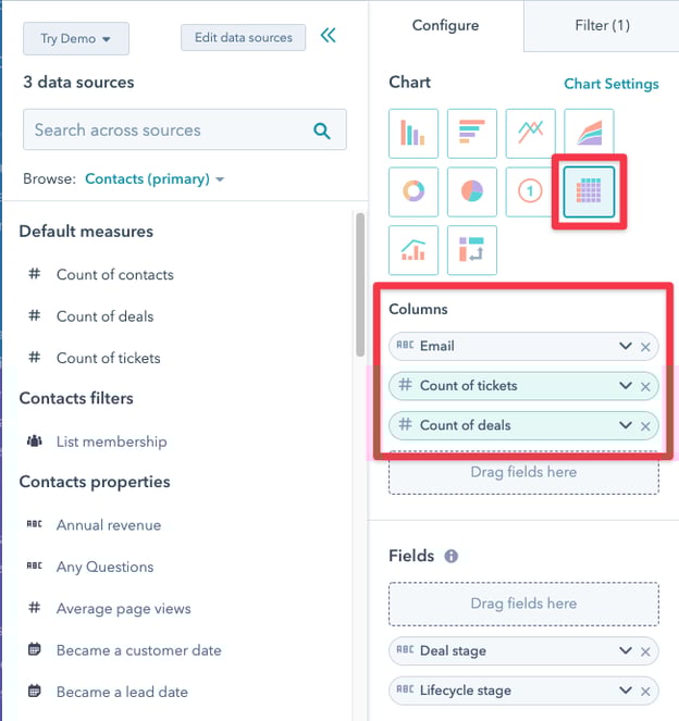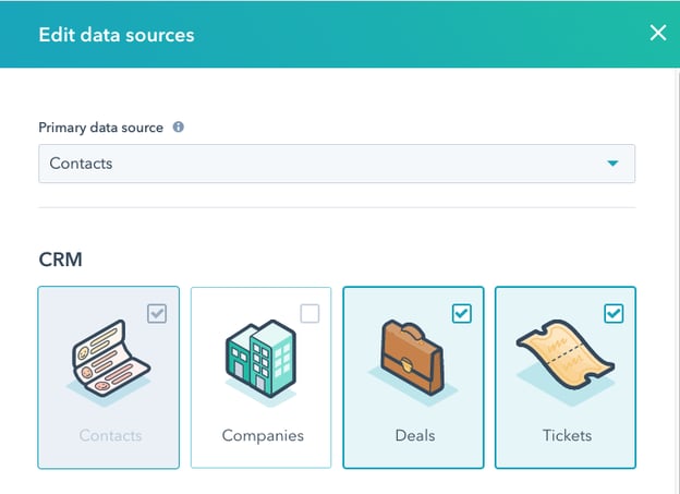 Set Contacts as your Primary Source and then Deals and Support Tickets as additional:
