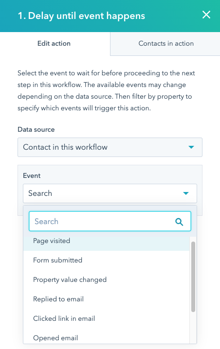 These events mean that you can set a workflow to wait until the contact visits a page, or submits a form or interacts with an email for example.