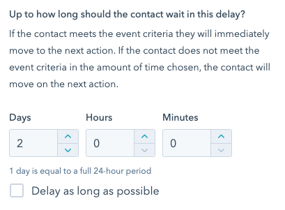 With this you can potentially manage just about everything eg you could create a custom property and have it updated by other workflows, or manual activities, or other ‘events’ not covered in the default list eg clicking on a CTA button could be used to create an Active list that then triggered a workflow to update a Property, which then meets this Delay requirement above. That’s a little complex and probably not something I’d do, but am mentioning it as an example of the power you have available.