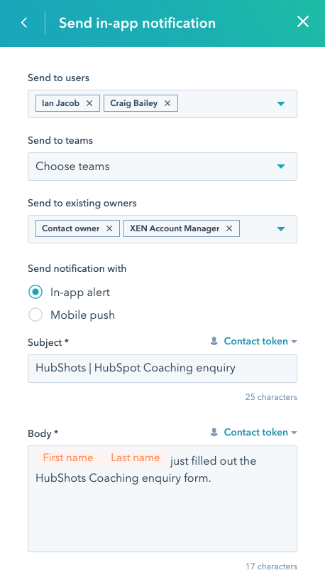 The notification can be sent to users, teams and/or owners, and can use contact tokens in the message: