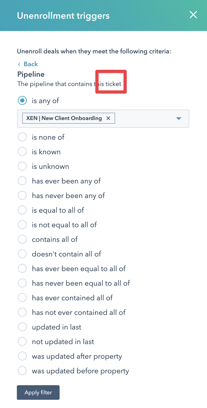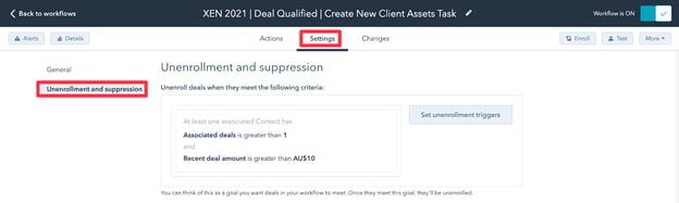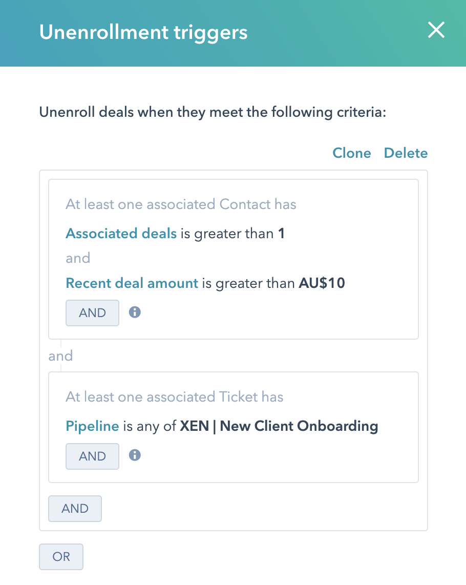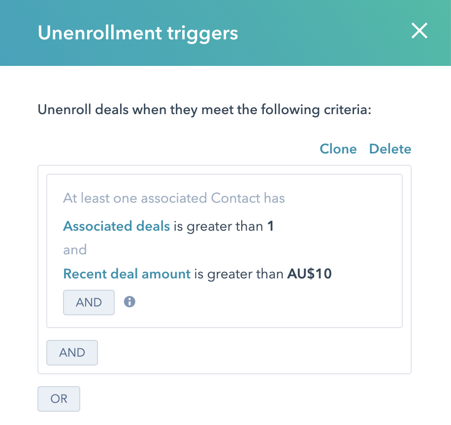 But perhaps you don’t want to do this if they already have another deal. You could make this part of the entry criteria, or you could make it part of Unenrollment criteria on the workflow eg: