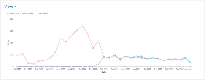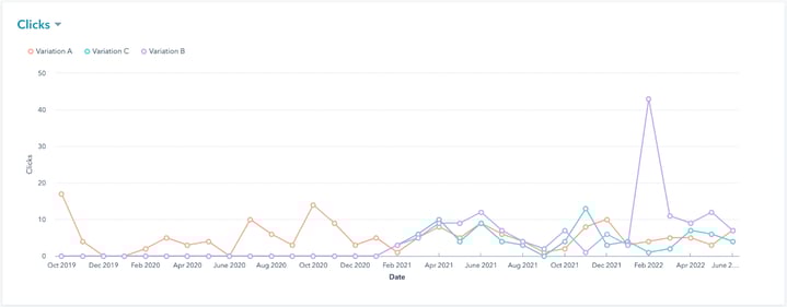 Based on the results, HubSpot has found a winning variation - and offers to limit the variations to just the winner. In this case I’ve kept all variations going because I suspect the winning selection was based on an unnatural spike in clicks (possibly when we were doing some testing):