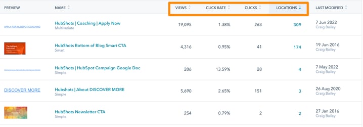 Your CTAs can be sorted by any of these columns as well, making it easy to see which CTAs are viewed the most, or are used in the most locations etc.