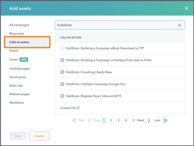 Note that CTAs can only be associated with a single campaign, so if you associate a CTA that is already associated with a separate campaign it will be removed from that separate campaign and added to your current campaign.