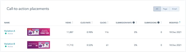 HubSpot CTAs have simple reporting to show how many views and clicks they’ve had. And this can be further broken down based on the variations.