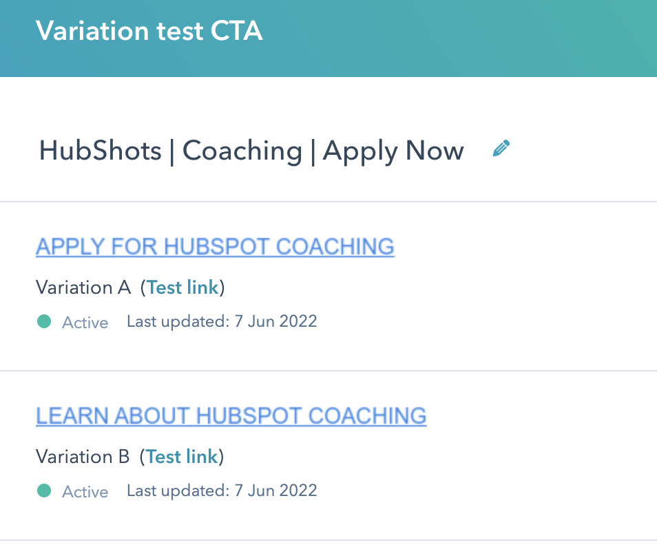 As a simple example, for our HubShots Coaching CTA we simply test different wording (everything else is the same):
