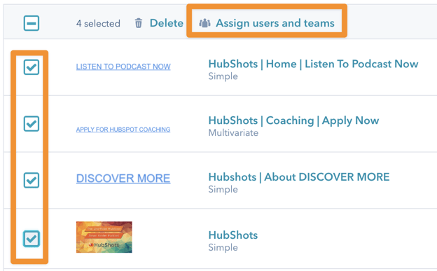 To assign the access, you need to click on the CTAs in the CTA listing, and then click the Assign Users and Teams link that appears at the top of the list: