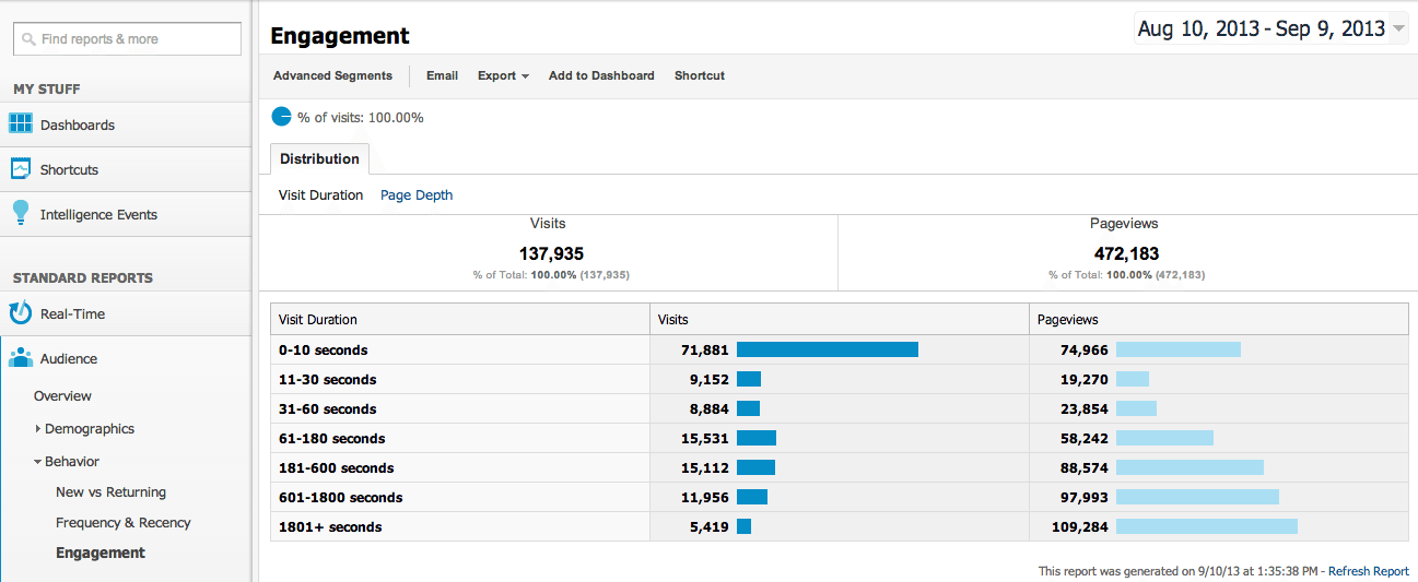 This is probably the single most important standard report produced by Google Analytics. How are visitors interacting with your site? This information has to be put into context. If you are running a technical support website, then you probably want visitors to be able to find what they want quickly and easily, similarly if you are running an e-commerce store, you want visitors to be able to make purchases quickly and easily. In either case, you are probably looking for visitors only to spend short amounts of time on these sections. On the other hand, if you are making a significant push in the area of content marketing, you want to see visitors spending time reading and exploring your content. Quickly skipping from one article to the next is a potential indicator of lack of engagement.
