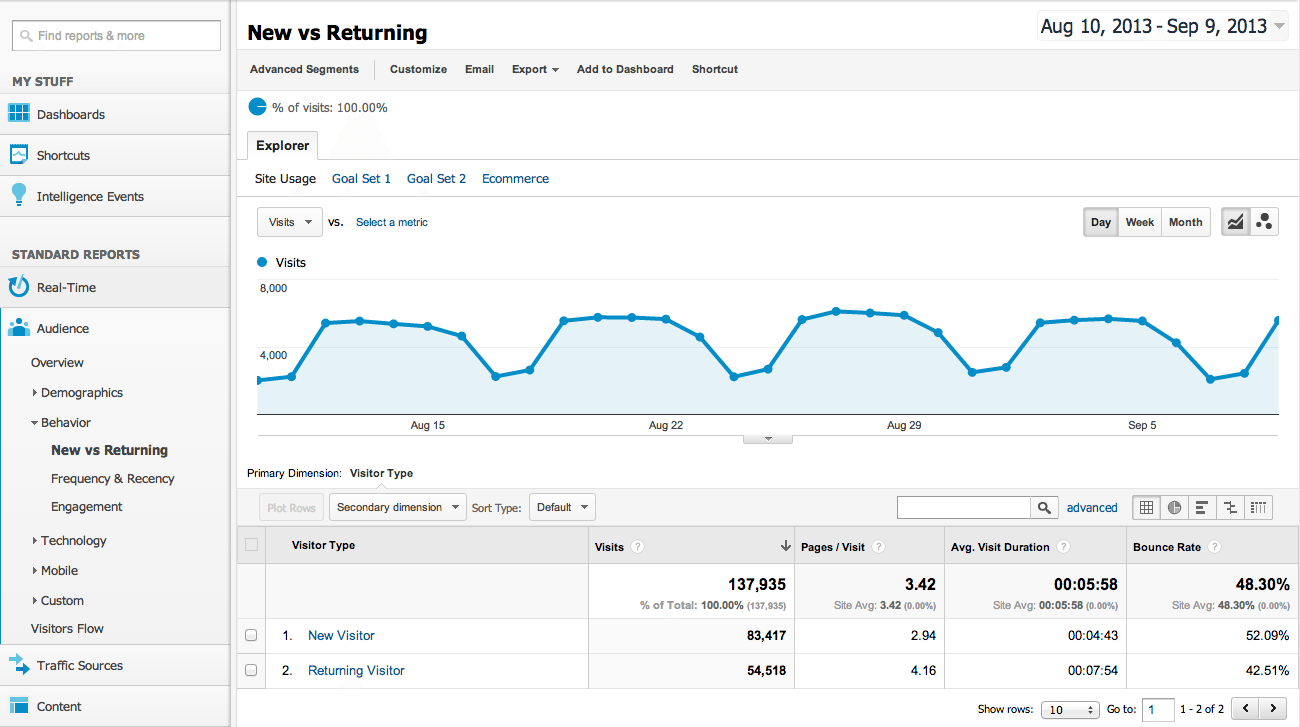 This information is crucial to any website and Google Analytics allows it to be integrated with other information for more meaningful data. For example, it can be integrated with the ecommerce statistics to see which visitor group is more valuable in terms of purchases, or with location and engagement reports to see where, geographically, your visitors are coming from and what they are doing on your site.
