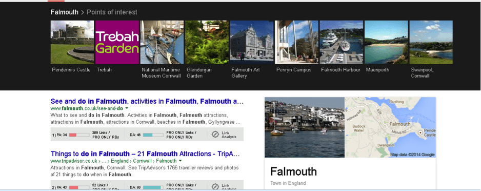 For the moment, not many searches bring up Carousel results, which appear at the top of the page in a ‘ribbon’. This only appears for certain types of searches too, so when I typed in ‘what to do in Falmouth’, I received a Carousel listing back as shown below.