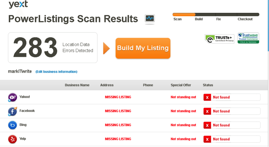 Yext PowerLister allows you to input basic information and gather data on local listings that are missing. You just input your business name, telephone number and your name and hit ‘scan’ and then a list appears telling you where you could be listed.
